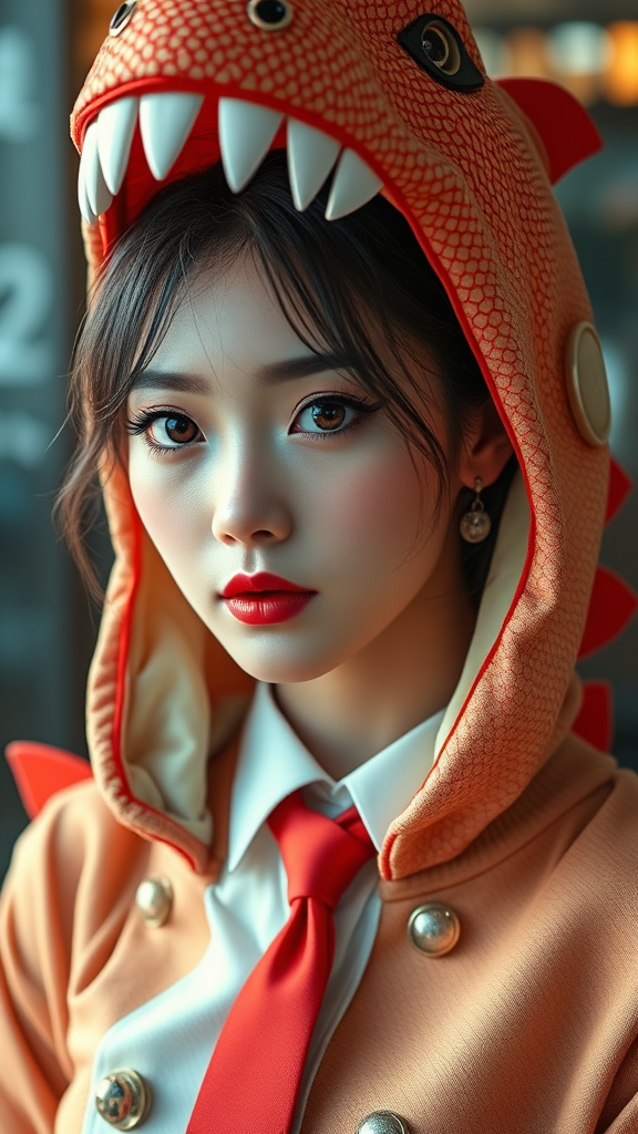 Stunning Korean woman, resembling a kpop idol, dressed in a whimsical dinosaur costume, with perfectly symmetrical eyes, ultra high-resolution, photorealistic 8k quality, showcasing hyperrealism, dramatic lighting akin to a professional photography session, wearing soft red lipstick and elegant jewelry, with a touch of CGI, 3D effect, and a doll-like appearance rendered in octane style, merging elements of cartoon, anime, and illustration. The digital art and digital painting capture a vivid scene with subtle hints of textural detail, while being cropped with intentional artful focus, showcasing jpeg artifacts abstractly; her attire includes a stylish tie and shiny buttons, with a palette highlighted by shades of red.