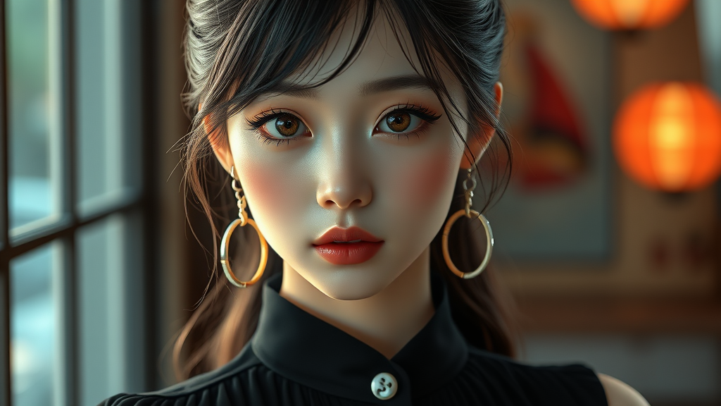 Stunning Korean woman with symmetrical eyes wearing a sleek black pleated tennis skirt, adorned in elegant jewelry, captured in ultra high-resolution photorealistic detail. The scene is vividly brought to life with dramatic lighting, showcasing a blend of photography and hyperrealism. The composition incorporates elements of CGI and 3D rendering, inspired by the aesthetics of a delicate doll with a touch of anime and cartoon flair. The illustration is a digital masterpiece, merging drawing and digital painting, with textural depth and an artistic edge. Despite minor imperfections like cropped edges and jpeg artifacts, the image maintains its captivating presence, featuring subtle details such as a button-adorned tie.