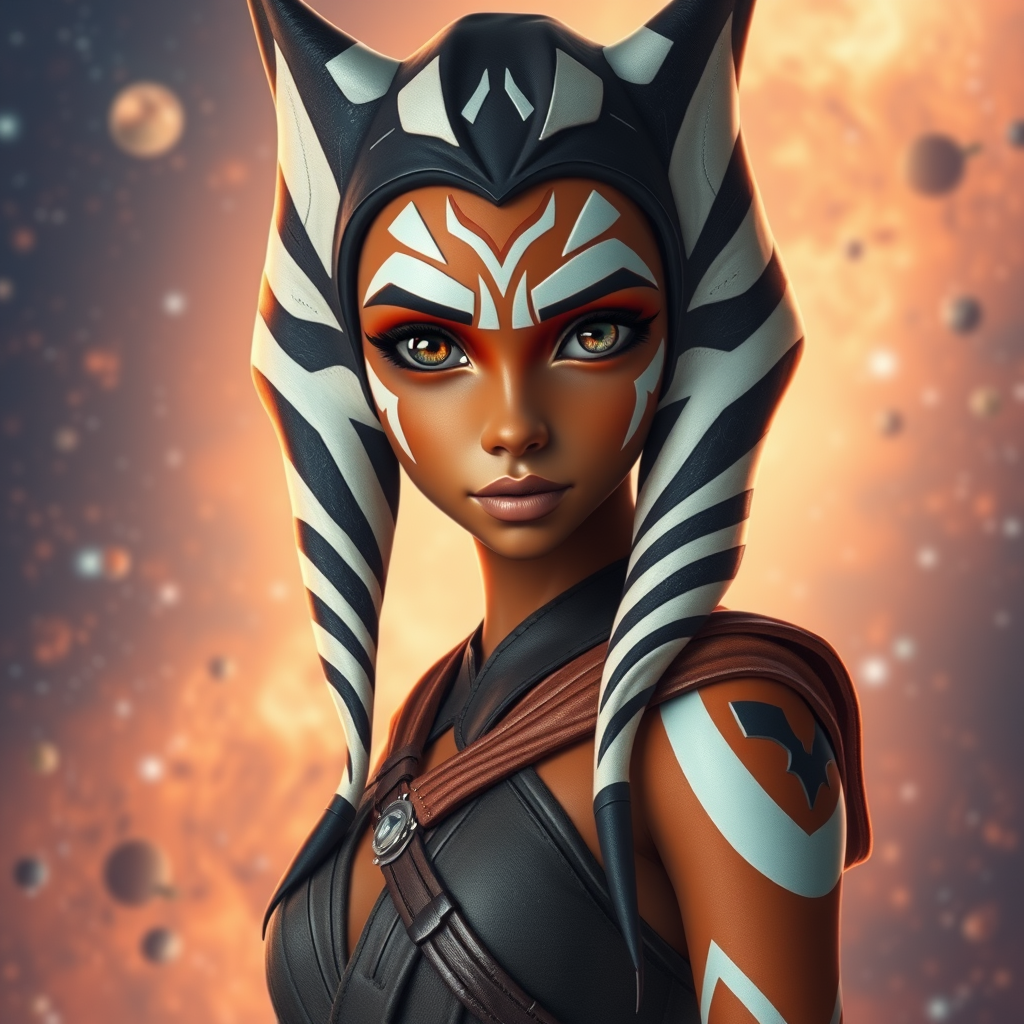 Stunning masterpiece depicting an alien girl inspired by Ahsoka from 'Rebels', standing against a mesmerizing space background. She gazes directly at the viewer, capturing attention with her confident expression and otherworldly charm. The cowboy shot composition enhances her presence, subtly emphasizing her intricate features and unique attire. The scene beautifully balances a sense of cosmic wonder and personal engagement, inviting the viewer into her universe.