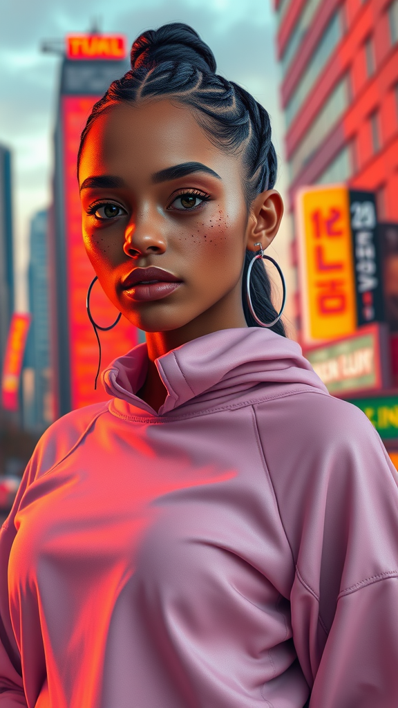Stunning multiracial woman with freckles modeling a stylish athleisure outfit against a vibrant cityscape backdrop, full body character concept art with impeccable costume design and illustration. Her features are symmetrical, emphasizing a singularly expressive face, all captured with cinematic color grading. This editorial-style fashion piece displays hyperrealism, resembling top trending works on ArtStation with inspiration from Guweiz. The artwork is incredibly detailed and intricate, exuding elegance through advanced VFX and postprocessing techniques, rendered with Octane for an 8k resolution.