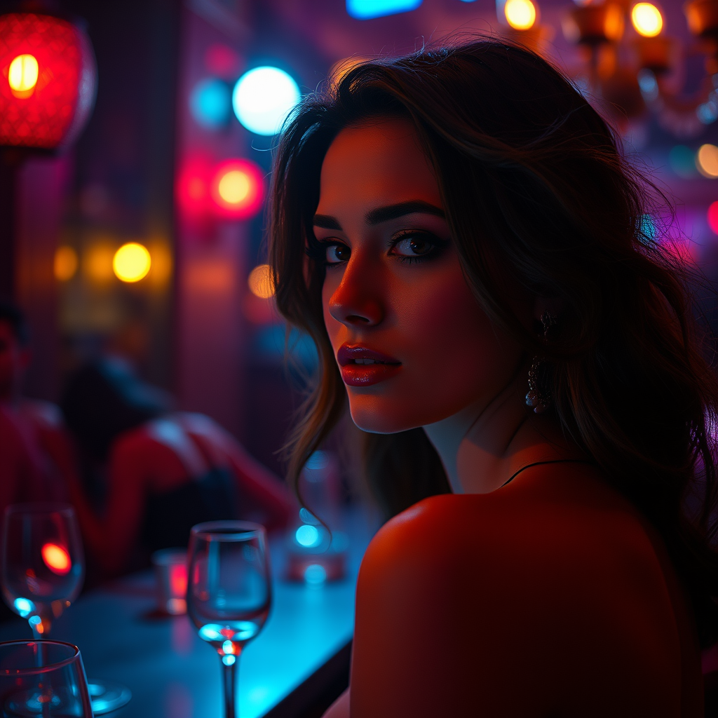 Stunning photography of a captivating woman immersed in the enigmatic glow of a night-time soiree in the sophisticated adult world, exuding sultry elegance. The scene is intricately detailed and features vibrant colors, with volumetric lighting creating a cinematic and photorealistic effect. The composition is sharp, with a smooth focus and immersive depth of field, reminiscent of Saul Bass's iconic style. Captured with a Hasselblad using an 85mm lens, f/1.4 aperture, 1/500 shutter speed, on ISO 100 film, this RAW photo radiates UHD clarity at 32k resolution.