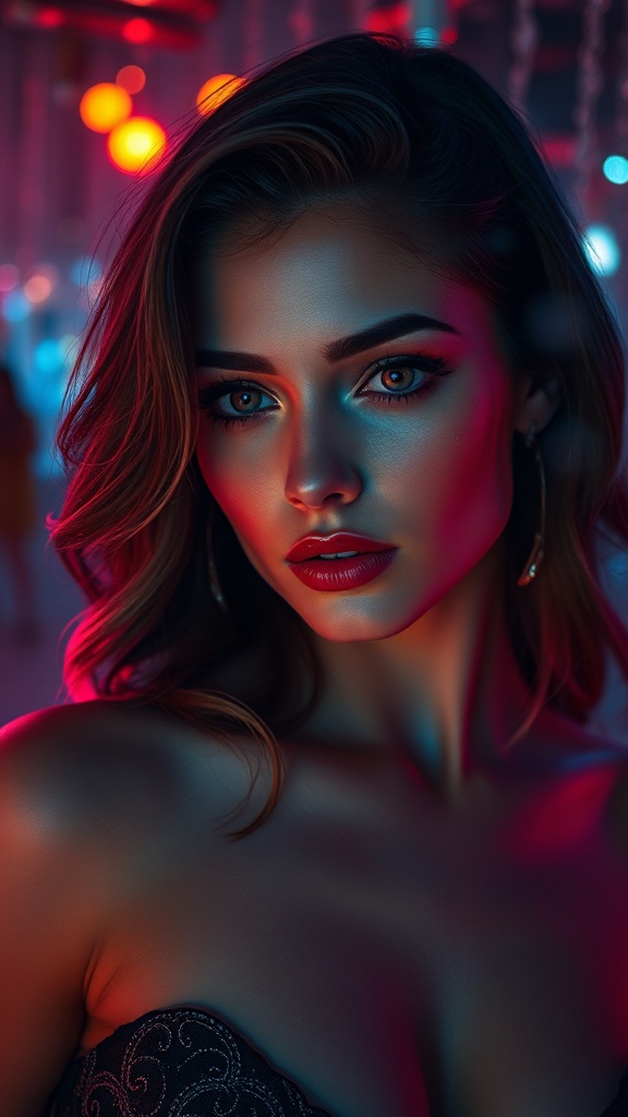View this AI-generated image featuring stunning portrait of an enchanting woman amid the immersive night ether gathering of the sophisticated adult world exuding sultry elegance deeply intricate and richly detailed showcasing vibrant hues volumetric lighting effects cinematic allure photorealism wit