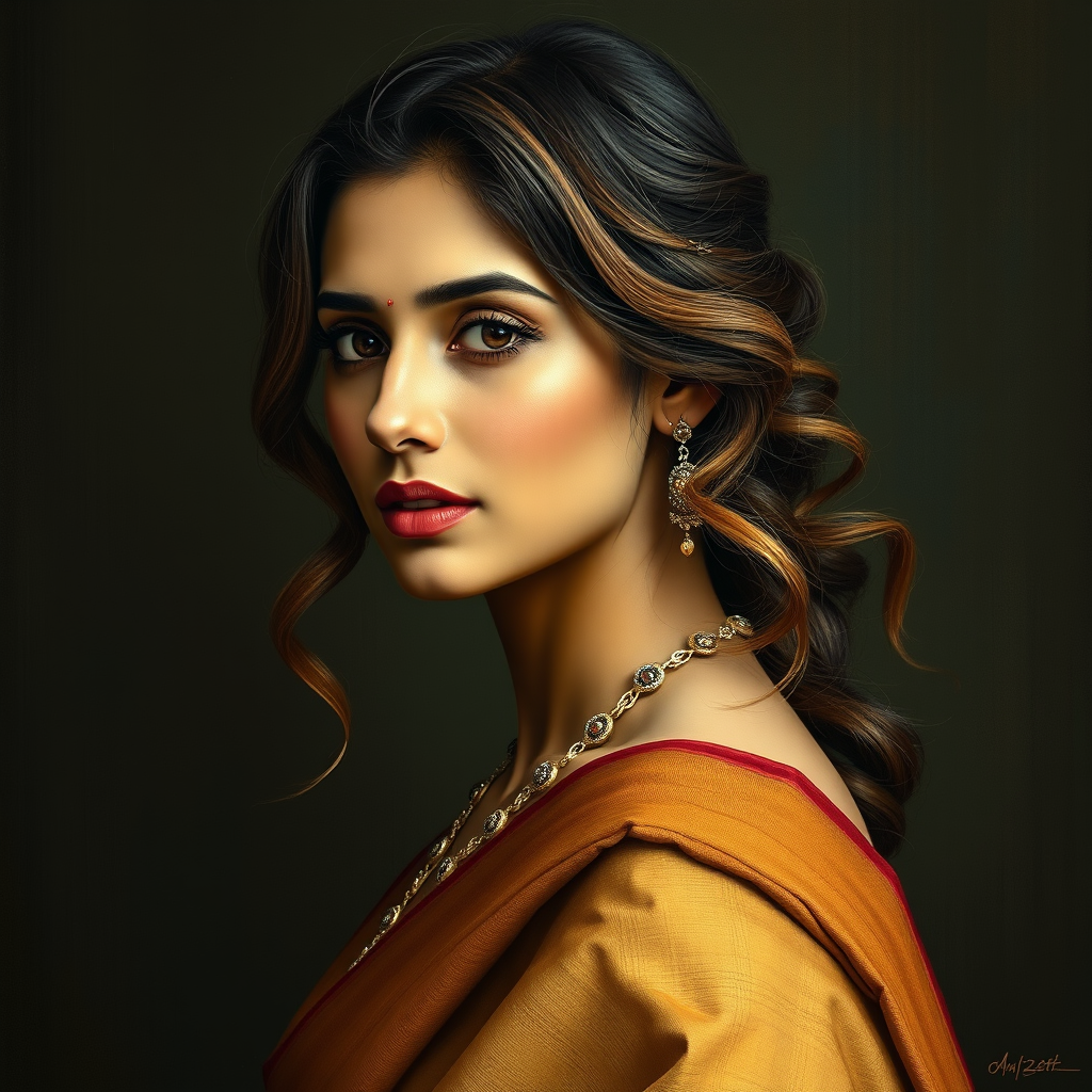 Stunning portrait of Deepika Padukone wearing a sari, captured from a side angle, showcasing her beautiful and highly detailed face, painted in the style of Rembrandt. The portrait is realistic yet possesses an ethereal quality, with a refined aesthetic sensibility. It embodies playful femininity and an unpolished authenticity, featuring ultra-realistic and expressive facial features. Her hair is wavy with a light brown hue, and the overall composition exudes an oshare kei influence, maintaining accuracy while enhancing the detailed aspects.
