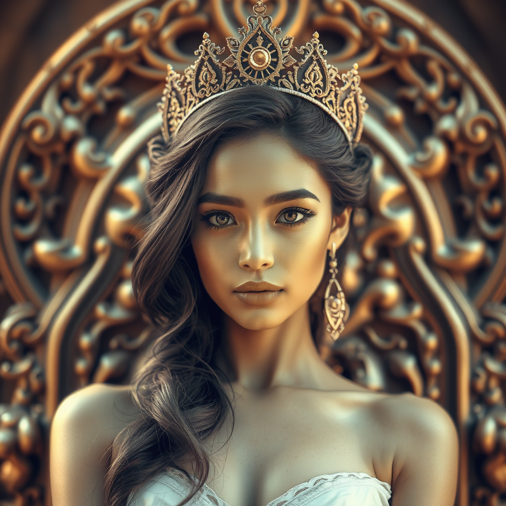 Stunning portrait of the enchanting Queen of the Cosmos, with sun-kissed skin, seated on a Mystical Throne, featuring warm tones and soft lighting. Captured in a 3D sepia-toned analog style, with emphasis on ethereal beauty. Avoid deformations and poor quality features; ensure realistic depiction with perfect anatomy, graceful proportions, and captivating expression. Keep the focus on elegance and cosmic allure, avoiding close-ups that obscure the frame. The portrayal should radiate a sense of celestial majesty and sophisticated poise.