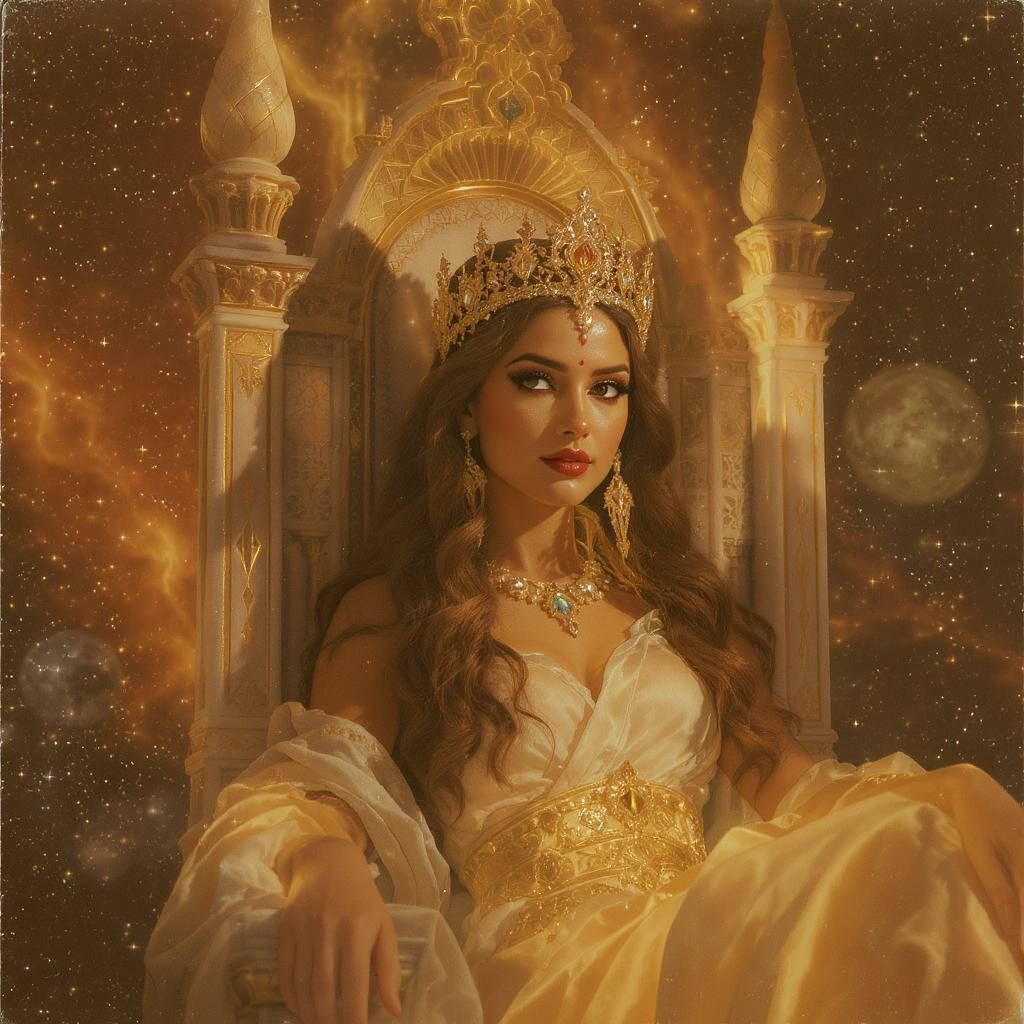 Stunning portrait of the exquisite Queen of the Cosmos, with sun-kissed skin, seated gracefully on an Ethereal Throne; the scene is bathed in warm tones and gentle lighting, embracing a 3D, sepia-toned ambiance akin to an analog photograph. The focus is on her radiant beauty, with a serene expression and an air of regal elegance. The surrounding atmosphere is harmonious and inviting, enhancing the captivating allure of this cosmic monarch.