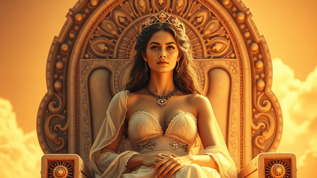 Stunning portrait of the radiant Queen of the Cosmos with sun-kissed skin, seated gracefully on an Ethereal Throne, enveloped in warm tones and gentle lighting. The scene is captured with a 3D, sepia, analog style, evocative of a classic photograph. Her presence is emphasized with a soft focus, ensuring an elegant composition and natural proportions. The image captures her serene expression and regal posture, embodying the beauty and grandeur of a cosmic queen.