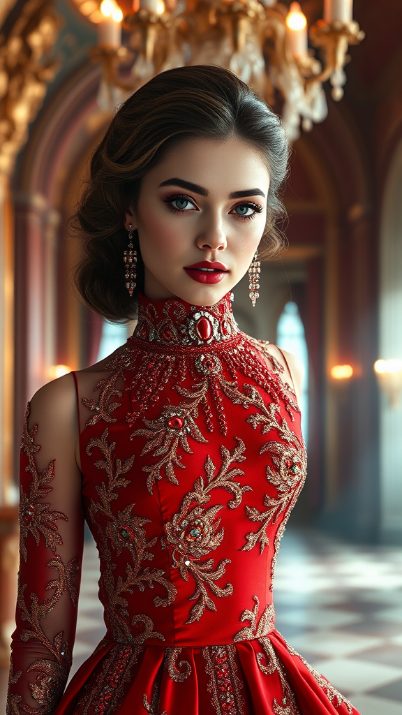 Stunning portrayal of Anyataylorjoy adorned in a breathtaking red gown crafted with glistening rubies and shimmering diamonds, featuring elaborate details on soft silk fabric with a rich brocade texture. Set in a Sci-fi Victorian great hall, the scene captures a beauty face with ultra-realistic, cinematic lighting, reminiscent of Peter Mohrbacher’s artistry. The turtleneck bridal gown is designed for a glamorous fashion show, offering a symmetrical, full-body view reminiscent of wedding photography. Rendered with meticulous detail akin to an octane render, this piece melds the elegance of the past with futuristic sophistication.