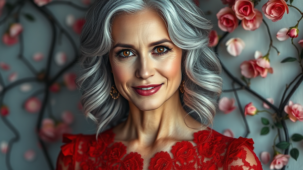 Stunning professional photograph capturing a single woman exuding elegance and grace, styled in a sophisticated party dress. Her wavy silver hair frames her face beautifully, complementing her intriguing red eyes and shy, enchanting smile. The dress is a rich red adorned with intricate lace and frills, enhancing her mature and graceful appearance. The background is adorned with fluttering petals and entwined rose vines, adding a romantic and dreamy atmosphere. The image boasts exceptional detail and clarity, rendered in 16k UHD HDR quality, showcasing a sharp focus and brilliant composition that draws the viewer in with its captivating allure. Her overall demeanor emits a mature yet elegant vibe, making the photograph an award-winning masterpiece.