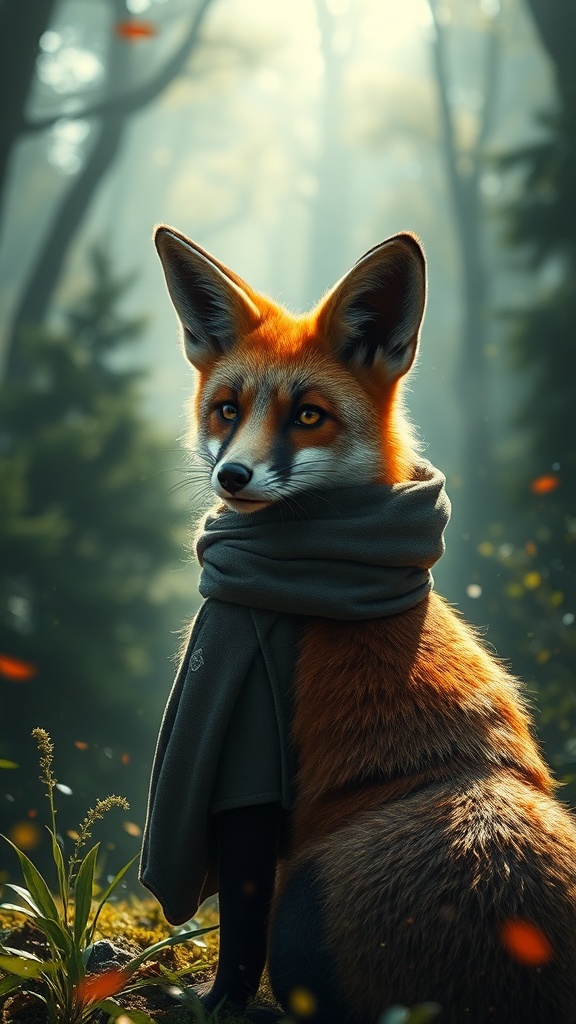 Stunning RAW color photograph capturing an awe-inspiring digital art masterpiece of a majestic, fully clothed fox with exquisitely detailed ears and tail, enveloped in lush, enchanting forest scenery. The composition exudes fantasy elements with a hint of D&D allure. High contrast and skillful backlighting highlight the scene, enhanced by subtle bloom effects and intricate chromatic aberrations. The image boasts a smooth, sharp focus, taken with a state-of-the-art mirrorless camera, ensuring unparalleled quality. Achieving photorealism, this 8k HDR work showcases vibrant fur texture and captivating light sparkles, embodying a true award-winning creation.