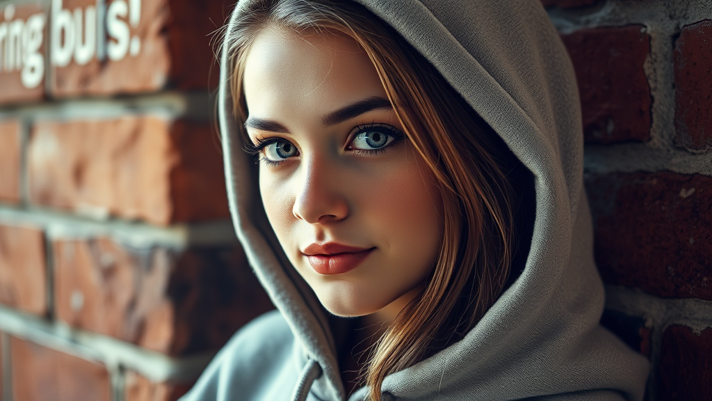 Stunning RAW photo of a beautiful girl wearing a hoodie against a textured brick wall, showcasing intricate details and a soft, natural expression. Captured with hyperdetailed photography, the image features soft lighting that enhances her features and creates an aesthetic appeal. The high detail and sharp focus are reminiscent of a trending piece on ArtStation and Pixiv, rendered in 8k UHD quality using a DSLR. The composition highlights her unique style, with delicate elements and subtle lighting adding to the high-quality, artistic portrayal.