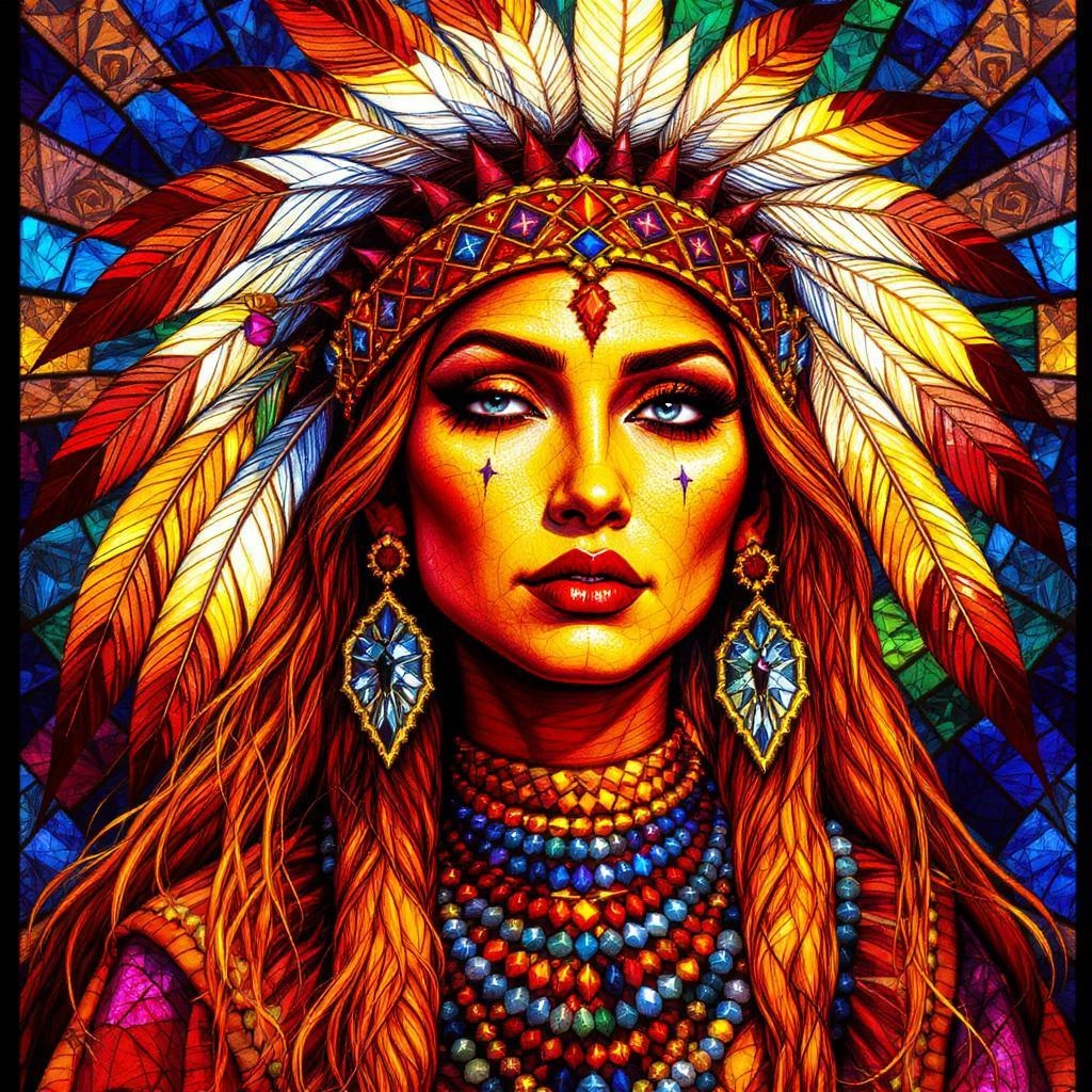 Stunning stained glass representation of a vibrant, psychedelic portrait of a Native American woman with intricately detailed feathers in her hair, featuring vivid colors and flowing orange hair. The artwork is in ultra-high definition, with high dynamic range and an 8K resolution. The subject's skin tone harmonizes with the colorful backdrop. Despite its striking beauty, the portrait incorporates subtle distortions: a long neck, extra fingers, and unique facial features like cross-eyed, uniquely shaped eyes, adding a touch of surrealism to the composition. The piece maintains clarity and definition, avoiding low resolution, artifacts, and distractions like watermarks or text, ensuring an immersive visual experience.
