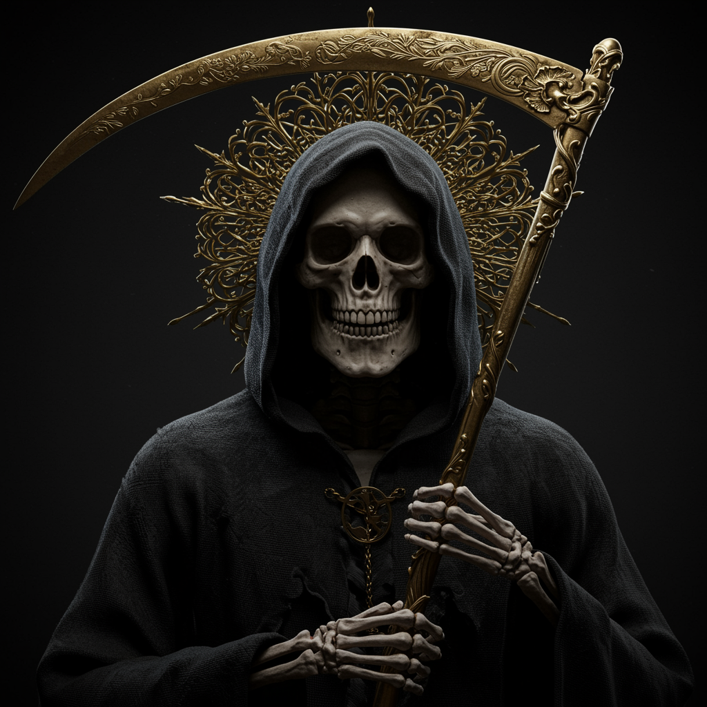 Stunning studio portrait of the grim reaper with intricate golden filigree details, captured in a low-key, high-contrast style. The image blends elements of CGI and traditional art, creating a hyper-detailed render with the look of a masterful illustration. The use of digital sculpting techniques emphasizes a haunting yet captivating figure, balancing realism and artistic expression.