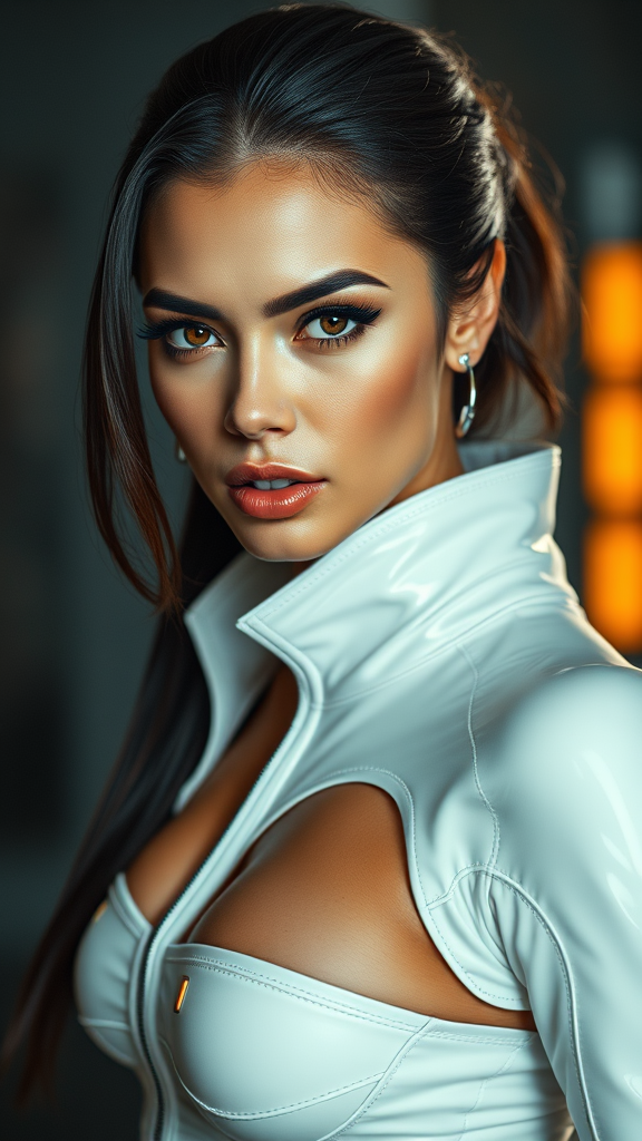 Stunning ultra-realistic image, premium commercial photography, fierce female protagonist in sleek white futuristic attire, expertly controlled studio lighting, 8k super high-resolution imagery, richly intricate detailing, meticulous texture, advanced color grading, cinematic aspect ratio 9:16, version 4 inspiration for depth and vibrancy.