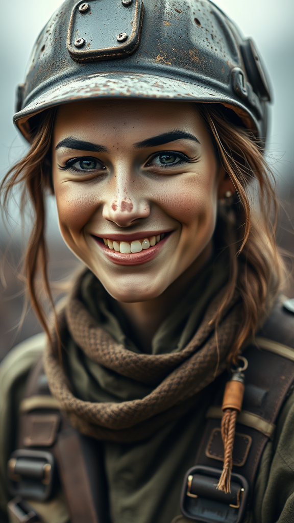 Stunning woman dressed as a miner, with smudged skin and clothes, smiling warmly, exuding charm, making eye contact with the viewer, captured in an engaging portrait photograph. The image features detailed and realistic depiction, with an 8k resolution offering high detail and depth, capturing her in a full-length frame. The artwork showcases high-detail RAW color, with a nose piercing, and employs soft, diffused lighting and a shallow depth of field for a sharp focus effect, achieving a hyper-realistic and cinematic feel. The visual maintains quality by avoiding low-resolution, cropped, or poorly drawn elements, ensuring accurate anatomy and proportions without unnecessary duplicates or distortions. The composition remains clean, with no extraneous elements such as long necks, usernames, watermarks, or signatures.
