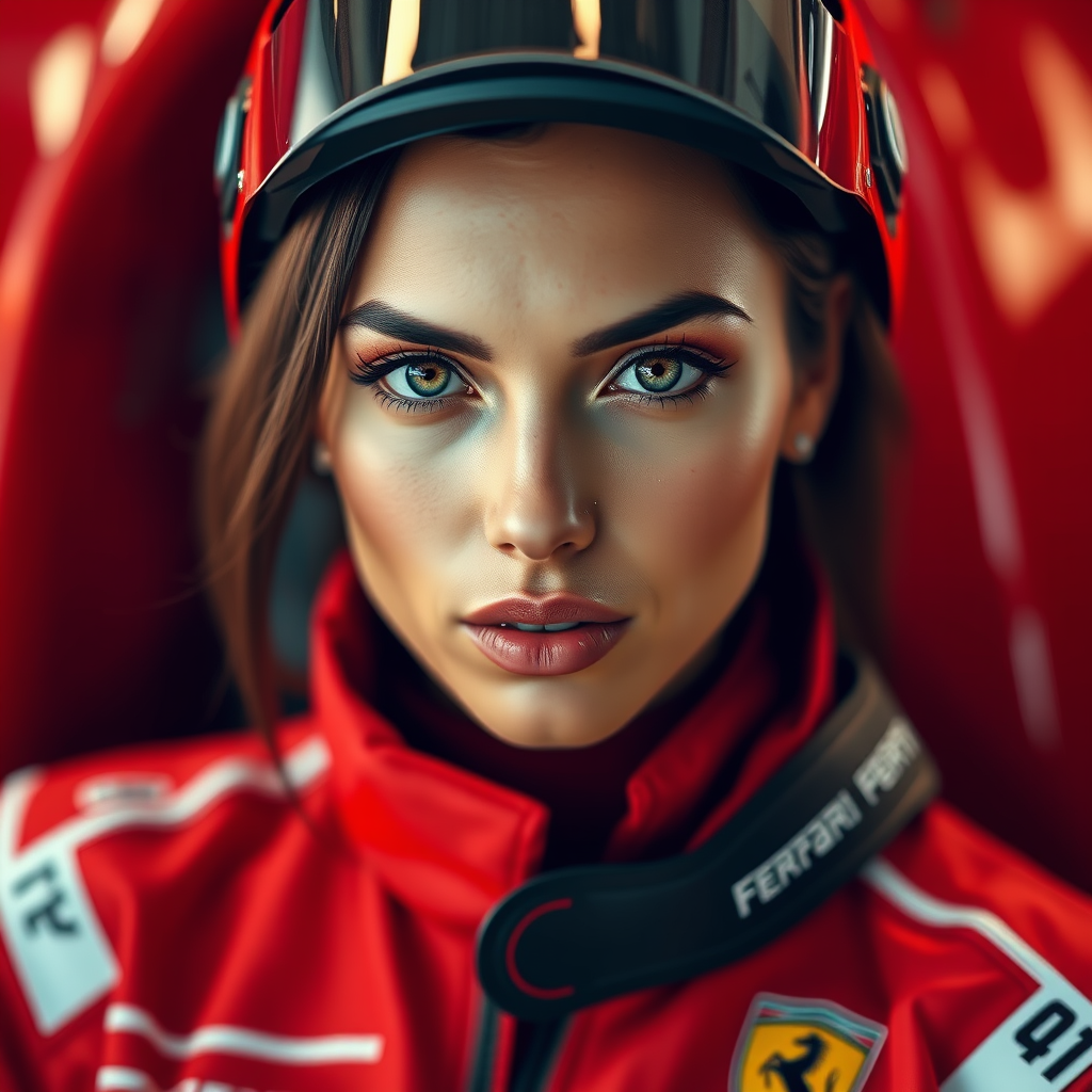 Stunning woman dressed in sleek F1 racing gear, embodying the essence of high-speed thrills, associated with Ferrari. Her enchanting gaze meets the viewer, capturing attention in a breathtaking portrait. The photograph showcases her incredibly detailed and realistic skin, with an 8k ultra-clear and finely detailed full-body shot. Utilizing high-detail RAW color artistry, her look is enhanced by subtle piercings, enveloped in a soft, diffused light with cinematic, CGI-style lighting. The shallow depth of field and sharp focus bring out a hyperrealistic quality, as if she stepped out of a movie, creating an immersive and captivating visual experience.