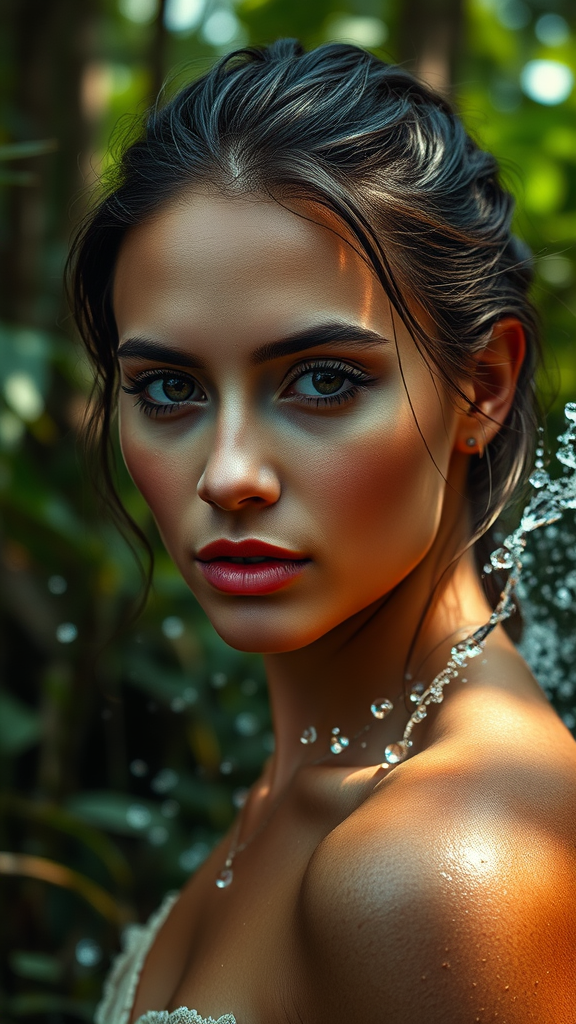 Stunning woman in a natural setting, captured in high resolution with a 50mm lens, her eyes exuding a natural allure. The photograph features cinematic lighting that highlights the fine details of her skin texture and brings out intricate features. She stands amidst a lush forest, with the background featuring a splash of water that adds dynamic movement to the composition. The entire scene is depicted in 8K quality, showcasing an immersive blend of natural beauty and wild surroundings.