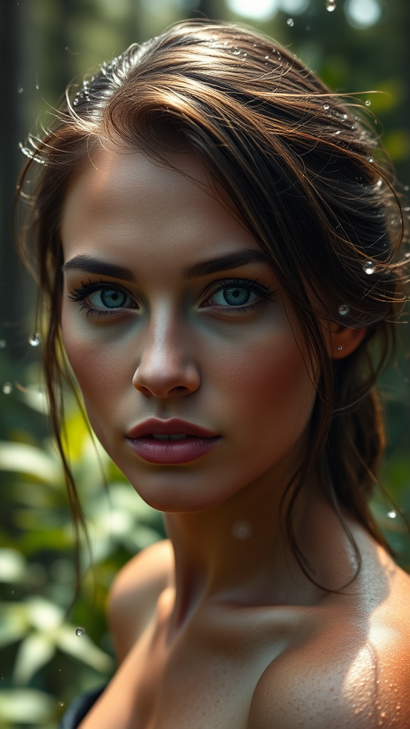 Stunning woman in a natural setting, high resolution portrait, 50mm lens, expressive eyes, cinematic lighting highlighting intricate skin texture, fine details, surrounded by a lush forest backdrop, water droplets creating dynamic movement, 8K quality, aspect ratio 2:3.