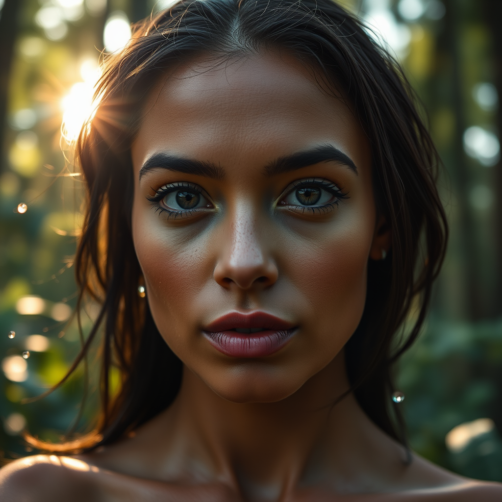 Stunning woman in a natural setting, high-resolution 50mm portrait photography, expressive eyes, cinematic lighting, exquisite skin texture details, complex intricate features, lush forest backdrop, gentle water droplets in the air, 8K quality.