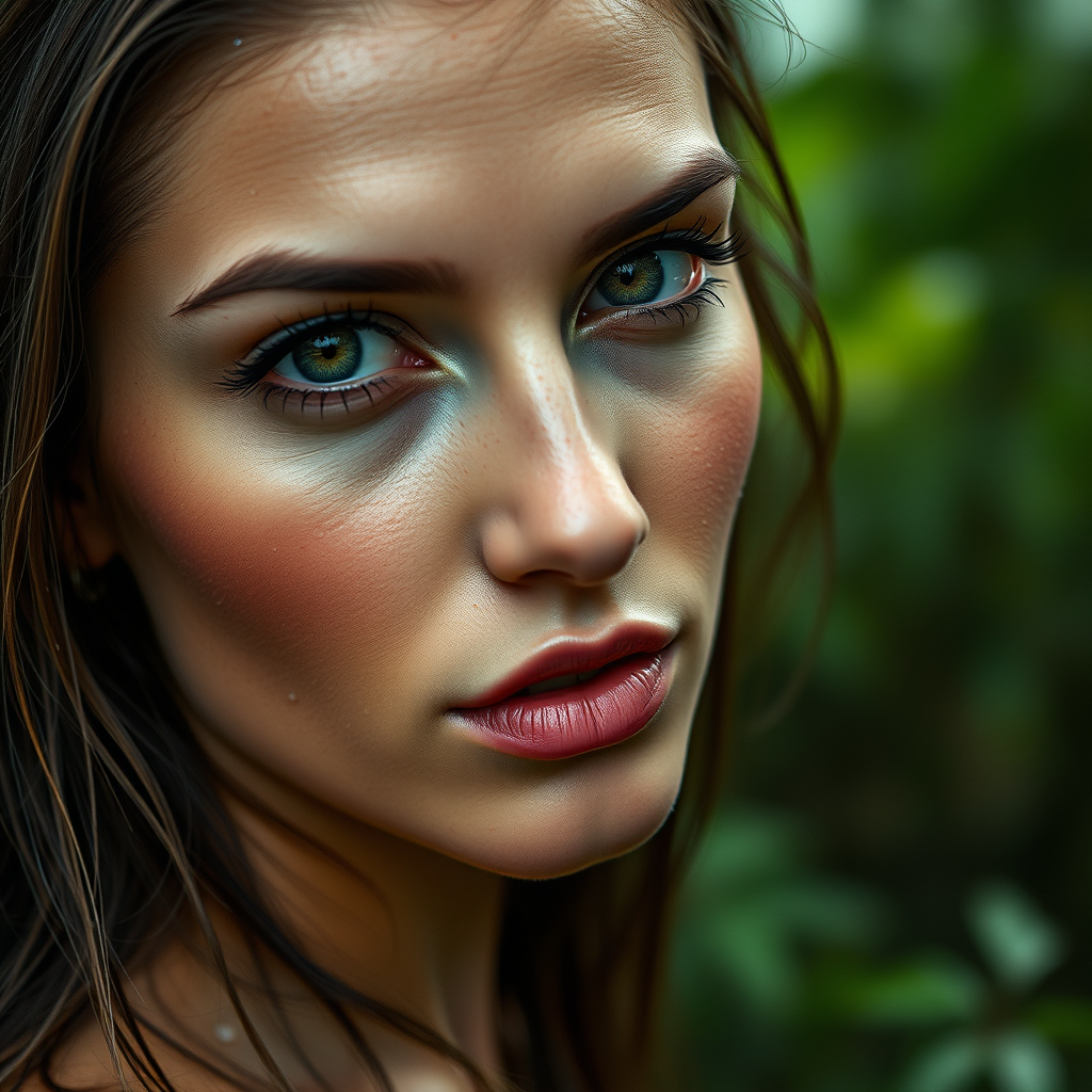 Stunning woman in a natural setting, high-resolution 50mm portrait photography, captivating eyes with a natural gaze, dramatic cinematic lighting, exquisite skin texture with fine details, complex features, lush forest backdrop, droplets of water adding dynamic movement, ultra-high-definition 8K resolution, maintaining a 2:3 aspect ratio.