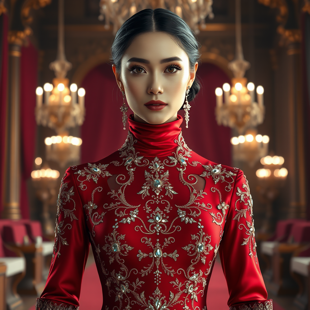 Stunning woman in an exquisite ruby-red gown adorned with shimmering diamonds and intricate embellishments, featuring luxurious soft silk and detailed brocade texture. The scene captures an haute couture fashion show within a Sci-fi Victorian-inspired great hall. The dress, a sophisticated turtleneck bridal gown, embodies an ultra-realistic depiction with a full-body symmetrical silhouette. Cinematic lighting enhances the beauty of her face, achieving a breathtaking wedding photography aesthetic. Inspired by Peter Mohrbacher's artistry, this 8k and 4k render is meticulously detailed, emphasizing the elegance of the design without focusing on hands or fingers.