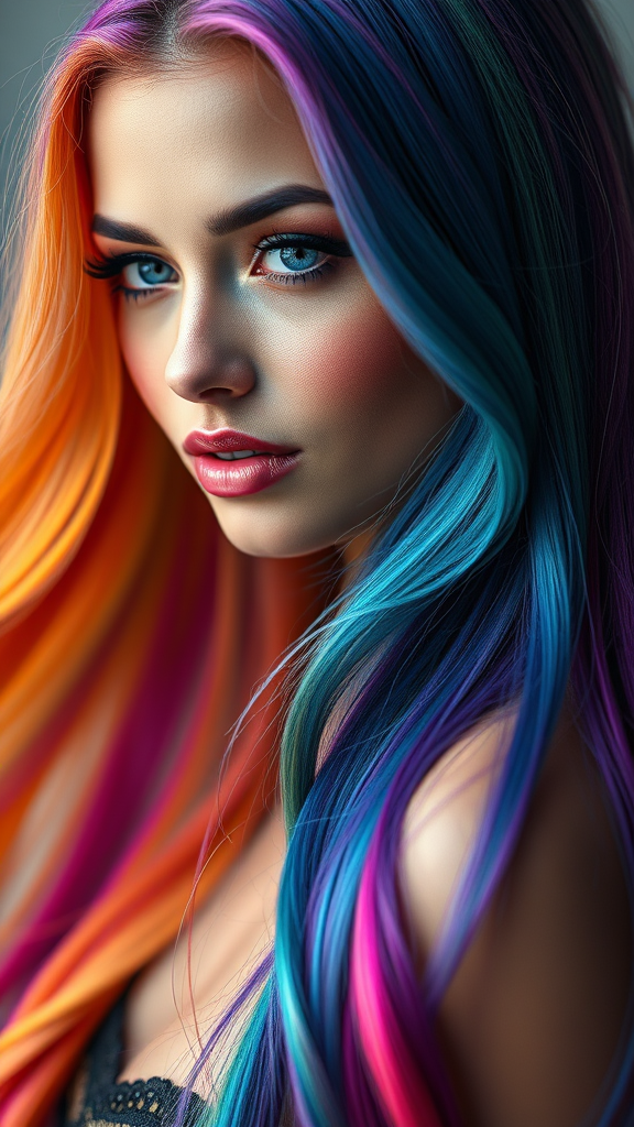 Stunning woman, long flowing rainbow hair, vibrant and eye-catching, charming and flirtatious, portrait style, realistic photography, detailed skin with photo-realistic qualities, 8k resolution, full body shot, high detail with RAW colorization, subtle piercing, softly diffused lighting, shallow depth of field, sharp focus, hyper-realistic, cinematic lighting, CGI elements, captivating and artful composition, avoids imperfections like text, errors, or low-res qualities, maintaining high quality and authenticity, ensuring proportions are natural, anatomy accurate, and visuals striking without distortions or unwanted elements.