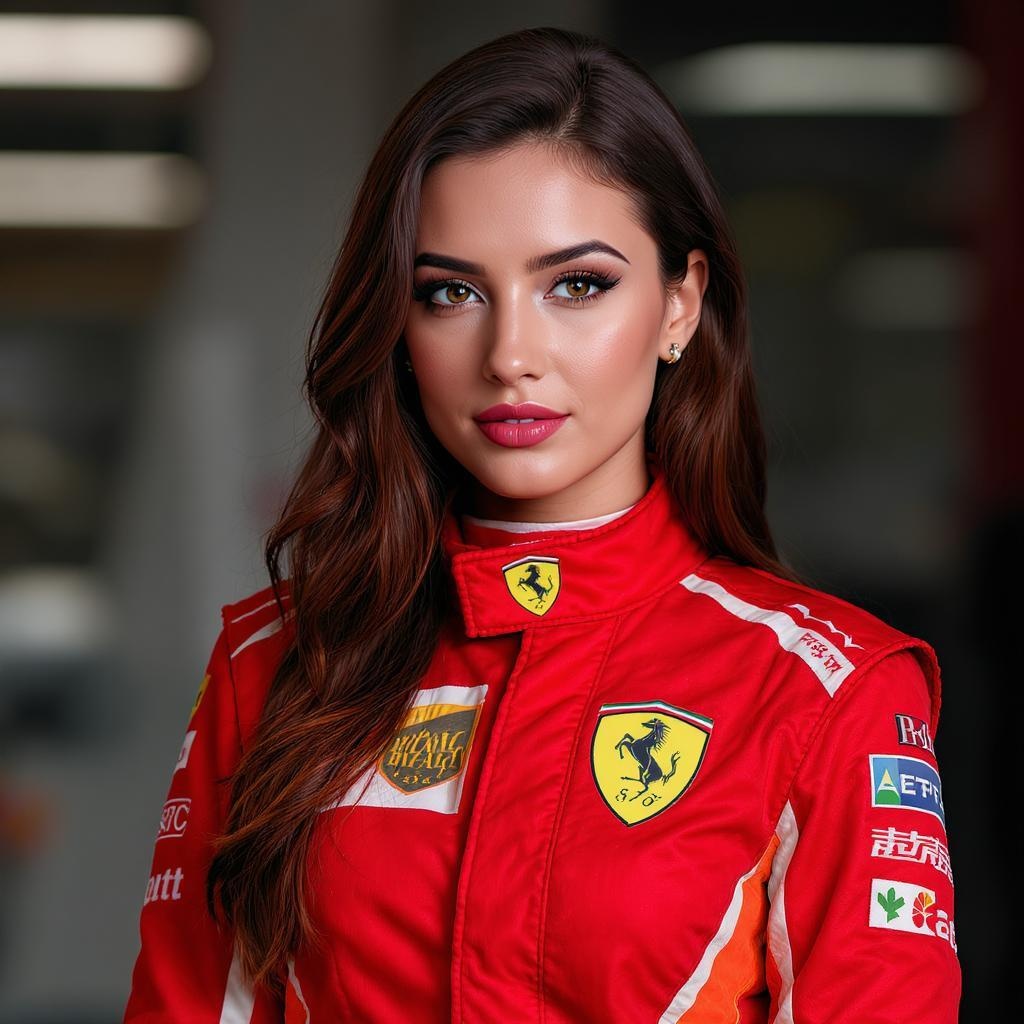 Stunning woman posed as an F1 driver, embodying the allure of Formula 1 and the iconic Ferrari brand, exuding charm, captivating gaze directly at the viewer, portrait-style photography, precise skin details, lifelike and photo-realistic, ultra-high-resolution imagery, complete full-length view, High detail in RAW colors, adorned with a piercing, enveloped in soft diffused lighting, employing shallow depth of field for sharp focus, hyperrealistic presentation, cinematic CGI lighting, with an understated 3D effect. Notably avoiding any artifacts, errors, or low-quality elements such as text distortions, cropping issues, or anatomical inaccuracies. Strives for flawless proportions and realistic anatomy, ensuring no duplications or deformities, resulting in a cohesive and visually appealing image without any extraneous or missing body parts. The image maintains artistic integrity by abstaining from watermarks or signatures.