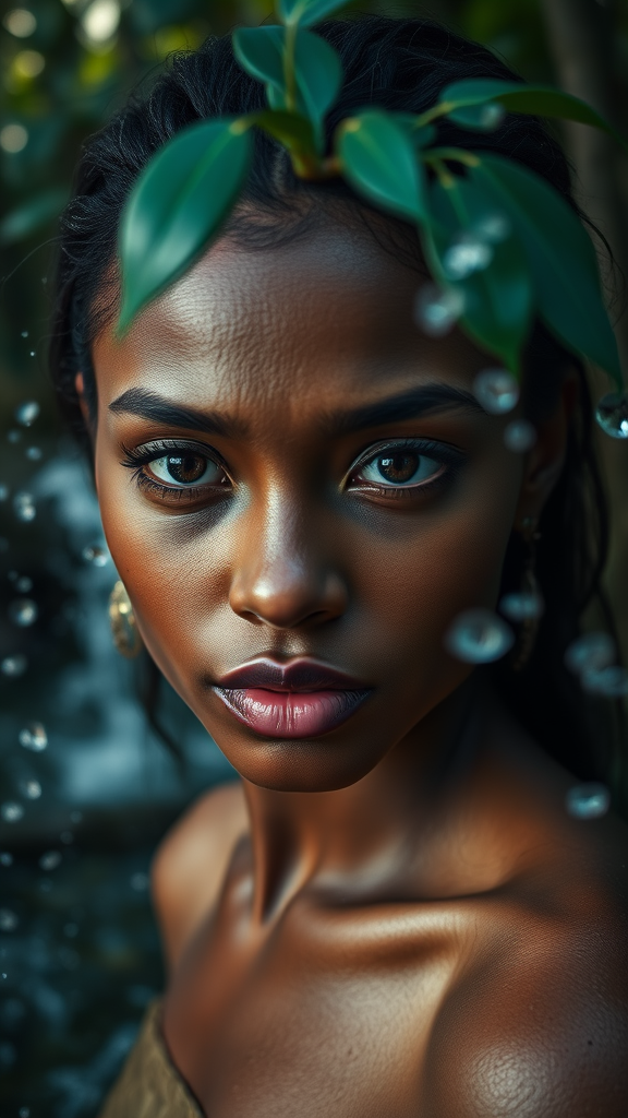 Stunning woman with untamed elegance, high-resolution 50mm portrait capturing her natural eyes, surrounded by cinematic lighting that enhances the exquisite details of her skin texture, set against a backdrop of a lush forest with a playful water splash, in ultra-sharp 8K resolution, with a 2:3 aspect ratio.