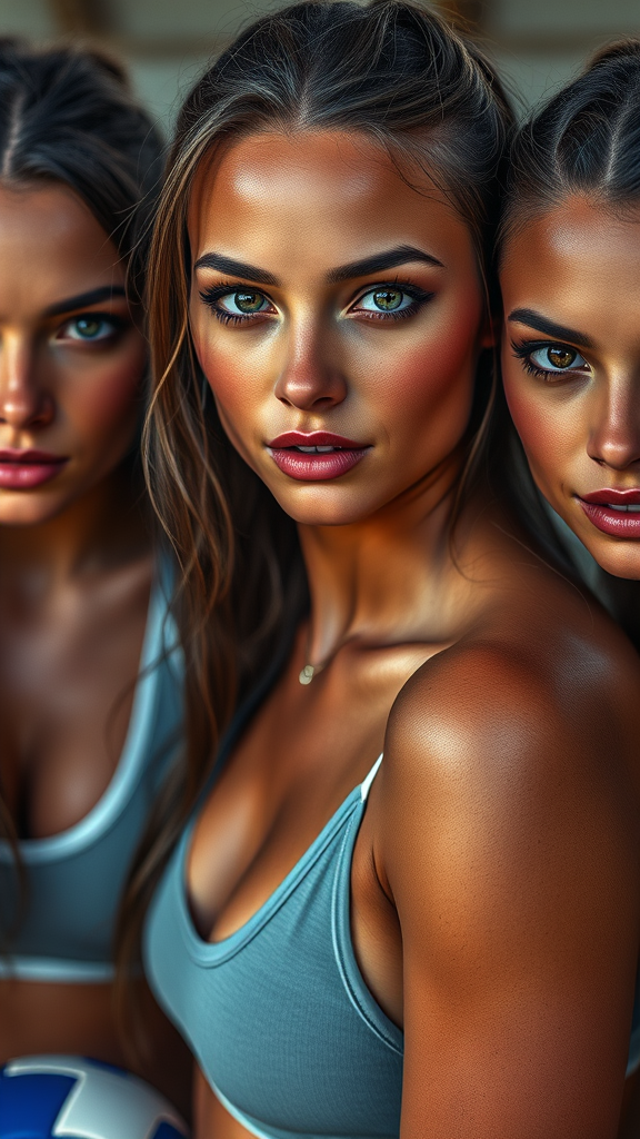 Stunning women portraying volleyball players, enticing, engaging eye contact with viewer, photography, intricate skin texture, lifelike, ultra-realistic, captured in 8k, exceptionally detailed, full-length composition, High-resolution RAW color imagery, soft, diffused lighting, shallow depth of field for focus, sharp clarity, hyperrealistic, cinematic illumination CGI, 3d.
