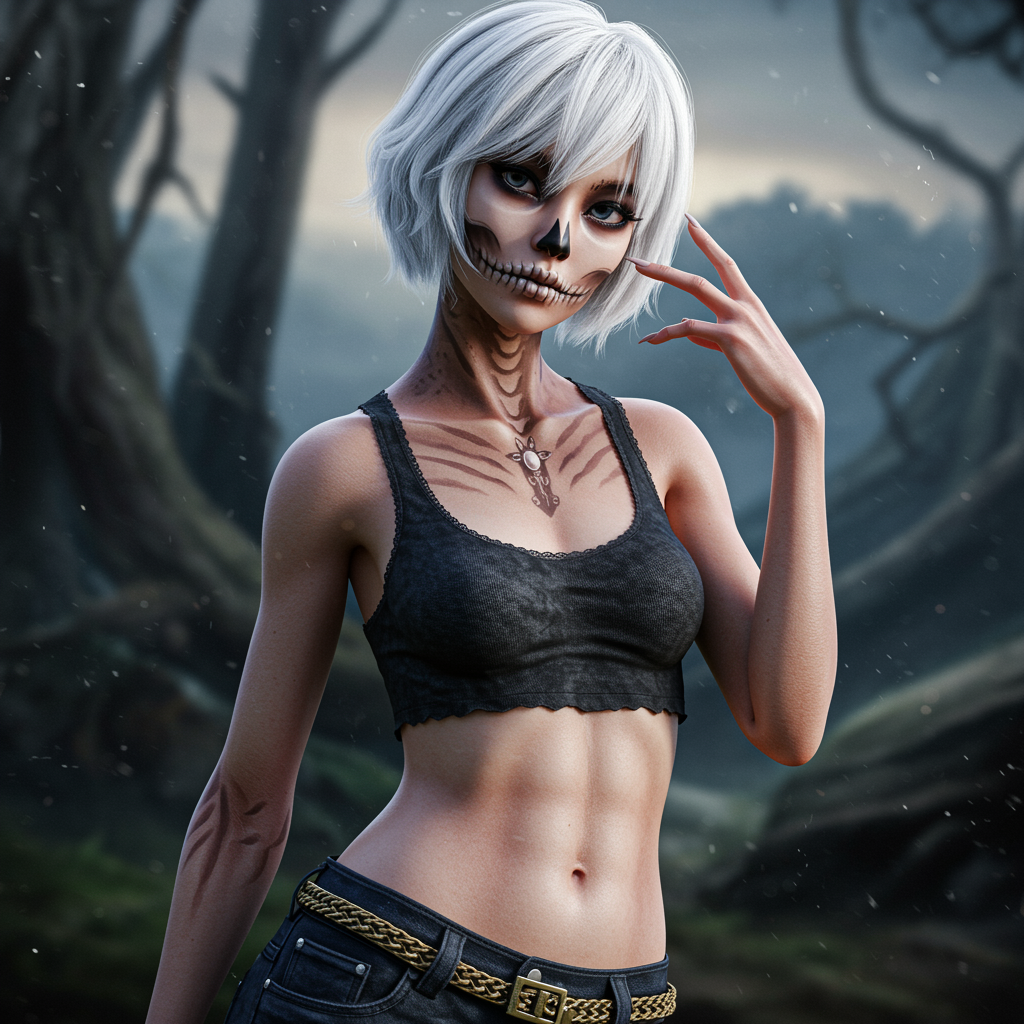 Stunning young Asian girl with short white hair, detailed and gorgeous face, embodying the essence of the queen of the dead, displaying a toned stomach and midriff. The scene captures her in a fantasy background, rendered in hyperrealistic, cinematic lighting. The photography-style portrayal emphasizes a breathtaking environment with a wide-angle perspective, reminiscent of the works by Greg Rutkowski and Magali Villeneuve. The depiction is in CGI, 3D with an artistically inspired, doll-like quality. Embrace subtle elements of artistic imperfection, with an emphasis on maintaining a sense of beauty amidst unusual anatomical features like extra appendages, imperfect hands, and unexpected forms, contributing to a unique visual narrative.