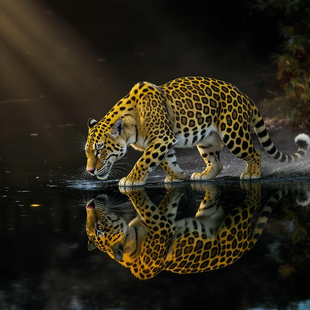 Stunningly detailed, ultra-high resolution official wallpaper of a majestic jaguar gracefully pacing across shimmering water, fixated on its own reflection, illuminated by cinematic lighting. The composition harmonizes with the golden ratio, offering elegance in every contour. This masterpiece captures award-winning quality with sharp focus and intricate detail, enhanced by HDR backlighting for a breathtaking visual experience. The scene emanates grandeur and refinement, a visual narrative intertwined with natural beauty, akin to a masterpiece crafted by CinemaHelper and PhotoHelper.
