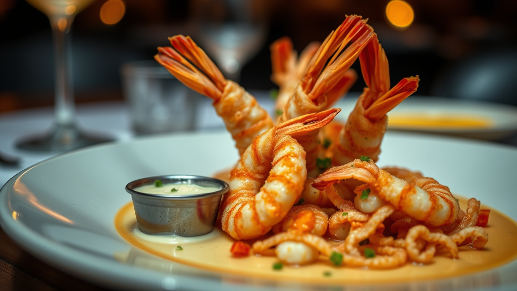 style: close-up shot | genre: gourmet | emotion: enticing | scene: crispy shrimp platter with lemon aioli | tags: upscale food photography, minimalistic composition, moody lighting, sumptuous, sophisticated, delectable, rich flavors | camera: nikon z7 | focal length: 105mm | shot type: macro | composition: centered | lighting: gentle directional light | production: culinary stylist | time: dusk | location type: indoor setting - an elegant dining space