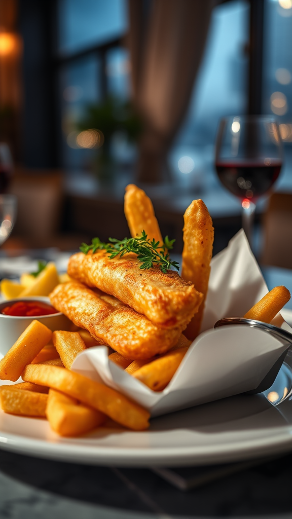 Style: close-up shot | Genre: gourmet | Emotion: enticing | Scene: elegantly plated fish and chips | Tags: premium food photography, clean layout, dramatic illumination, opulent, sophisticated, irresistible, lavish, gourmet | Camera: Nikon Z7 | Focal length: 105mm | Shot type: close-up | Composition: centered | Lighting: gentle directional light | Production: food stylist | Time: twilight | Location type: upscale interior ambiance.