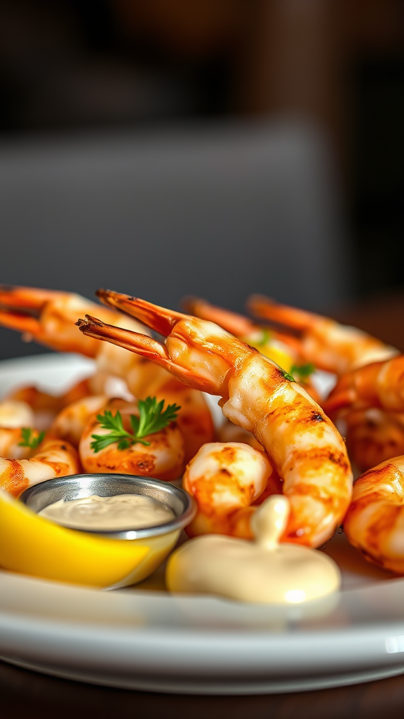 Style: close-up shot | Genre: gourmet | Emotion: irresistible | Scene: grilled shrimp platter with lemon aioli | Tags: high-end food photography, clean composition, dramatic lighting, luxurious, sophisticated, appetizing, decadent, culinary artistry | Camera: Nikon Z7 | Focal length: 105mm | Shot type: close-up | Composition: centered | Lighting: soft directional light | Production: food stylist | Time: evening | Location type: interior | Aspect ratio: 3:4 | Version: 5