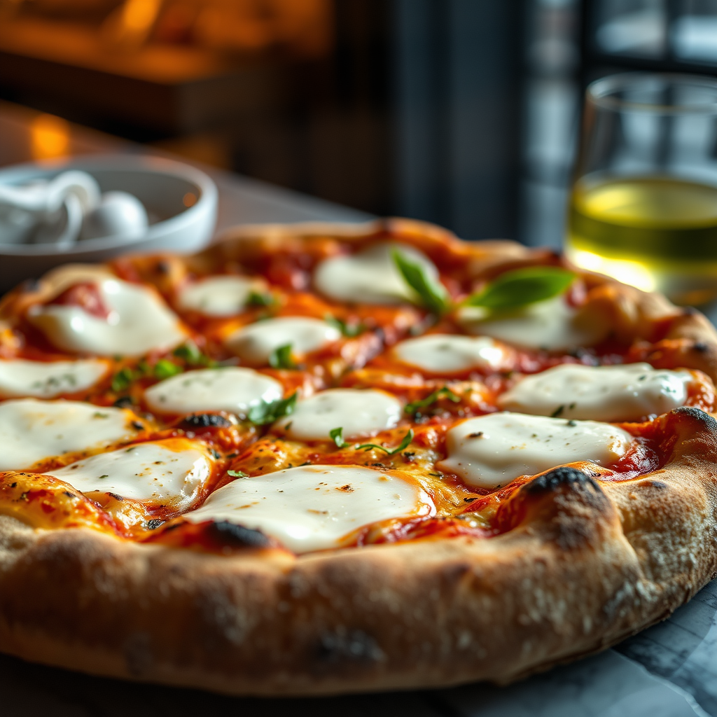 style: close-up shot | genre: gourmet | emotion: irresistible | scene: artisanal sourdough pizza with a generous layer of melted mozzarella | tags: premium food photography, pristine composition, dramatic lighting, luxurious, refined, appetizing, indulgent, gourmet | camera: nikon z7 | focal length: 105mm | shot type: close-up | composition: centered | lighting: soft directional glow | production: food stylist | time: early evening | location type: chic interior