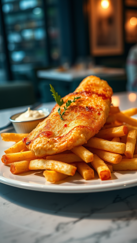 Style: close-up shot | Genre: gourmet | Emotion: mouth-watering | Scene: fish and chips | Tags: high-end food photography, clean composition, dramatic lighting, sophisticated, elegant, delectable, gourmet | Camera: Nikon Z7 | Focal length: 105mm | Shot type: close-up | Composition: centered | Lighting: soft directional light | Production: food stylist | Time: evening | Location: upscale interior restaurant | Aspect ratio: 3:4 | Version: 5. The setting includes a gleaming plate with golden, crispy fish resting atop a bed of perfectly salted fries. A delicate swirl of tartar sauce and a sprinkling of fresh herbs add an exquisite touch, while the rich, ambient glow of evening light enhances the luxurious allure of the dish.