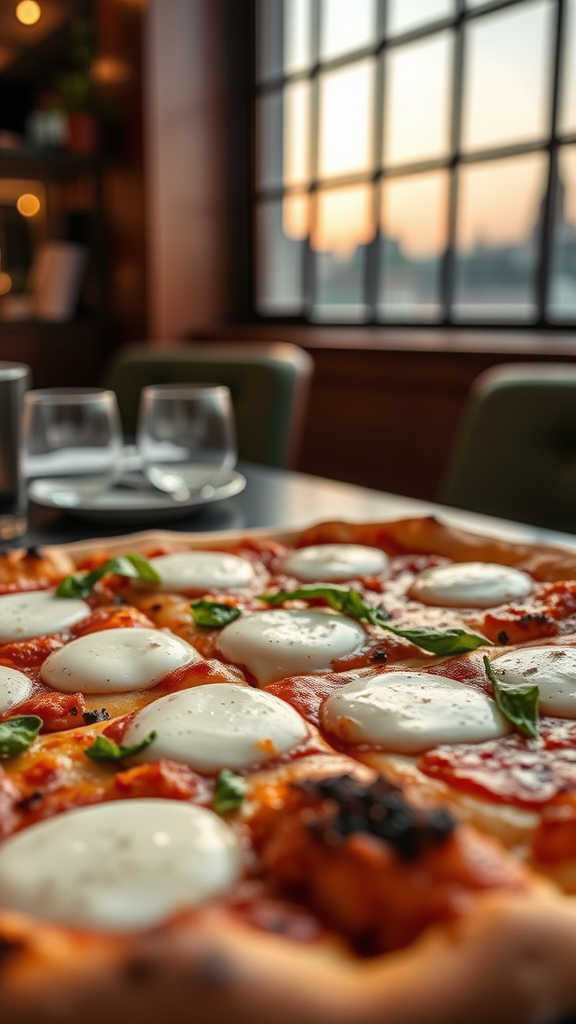 Style: detailed focus | Genre: epicurean | Emotion: captivating | Scene: artisan sourdough pizza with a generous layer of gooey mozzarella | Tags: premium culinary photography, pristine composition, intense illumination, opulent, refined, appetizing, extravagant, gourmet | Camera: Nikon Z7 | Focal length: 105mm | Shot type: detailed focus | Composition: centralized | Lighting: gentle side lighting | Production: culinary stylist | Time: dusk | Location type: sophisticated interior