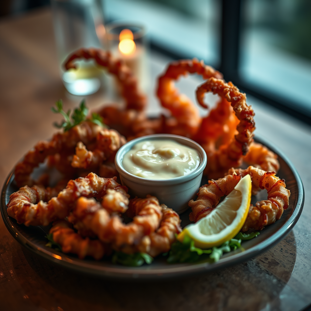 style: detailed macro shot | genre: gourmet cuisine | emotion: irresistible | scene: crispy calamari platter with lemon aioli | tags: premium culinary photography, pristine arrangement, moody lighting, luxurious, refined, tantalizing, opulent, epicurean delight | camera: nikon z7 | focal length: 105mm | shot type: macro close-up | composition: perfectly centered | lighting: gentle directional glow | production: culinary artist | time: dusk | location type: upscale interior --ar 3:4 --v 5