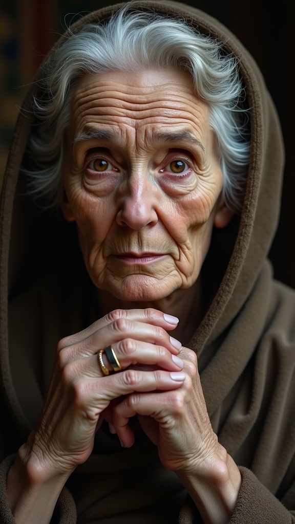 Style of Roberto Ferri, professional portrait, upper body of an elderly woman in humble attire, ornate, medieval, high fantasy RPG, high quality, highly detailed, expressive eyes, 16k, UHD, HDR, intricate textures, subtle imperfections in the iris and pupils, slightly cross-eyed, unique facial features, carefully detailed hands with character, close focus, refined resolution, clear, without text or artifacts, no signature, singular perspective, natural proportions, complete composition.