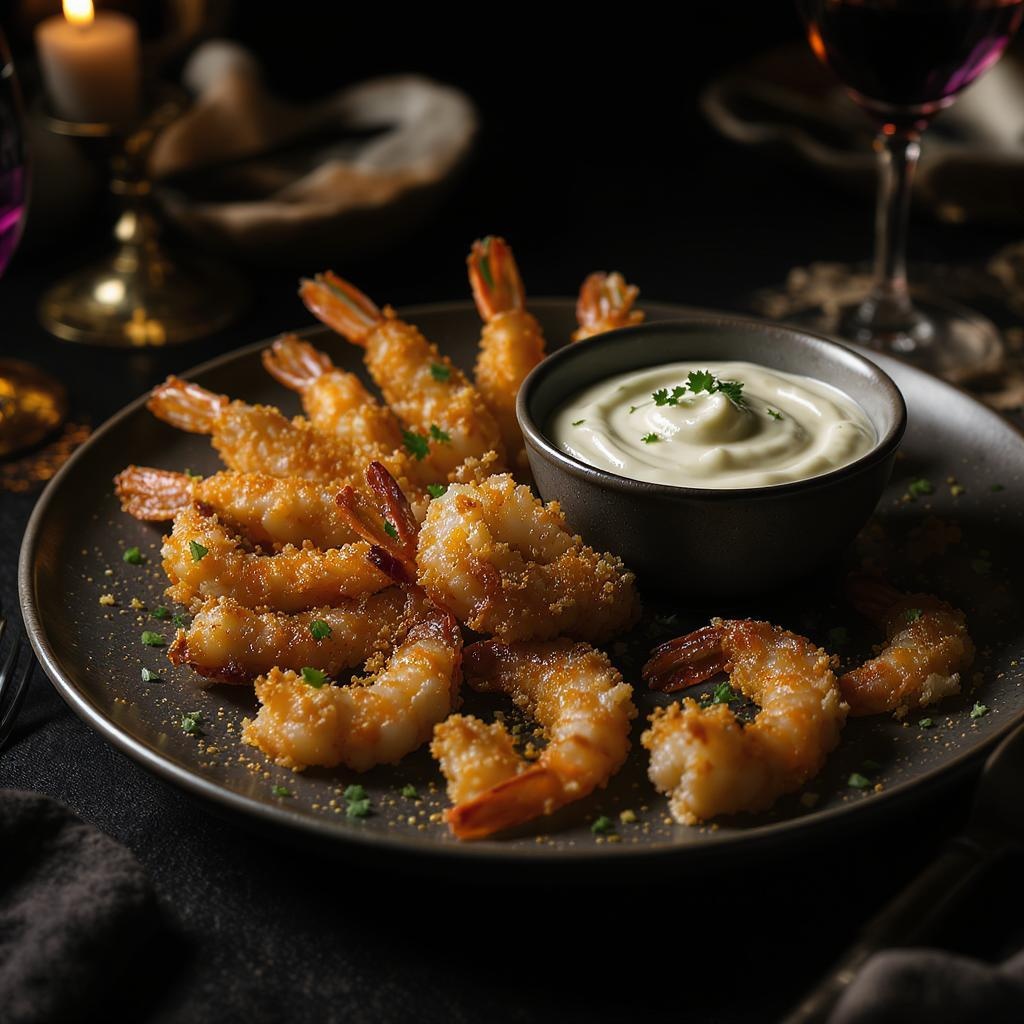 Style: intimate shot | Genre: culinary artistry | Emotion: enticing | Scene: golden crispy shrimp platter with a bowl of homemade aioli | Tags: premium food photography, pristine composition, moody lighting, sophisticated, refined, appetizing, lavish, gourmet | Camera: Nikon Z7 | Focal length: 105mm | Shot type: intimate close-up | Composition: centralized focus | Lighting: gentle directional illumination | Production: culinary stylist | Time: twilight | Location type: upscale interior