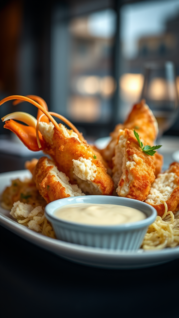 Style: macro shot | genre: gourmet cuisine | emotion: irresistible | scene: luxurious fried lobster platter with aioli sauce | tags: premium culinary photography, minimalist layout, bold lighting, sophisticated, opulent, appetizing, lavish, gourmet | camera: Canon EOS R5 | focal length: 85mm | shot type: macro | composition: symmetrical | lighting: subtle gradient light | production: culinary artist | time: dusk | location type: refined dining room --ar 3:4 --v 5