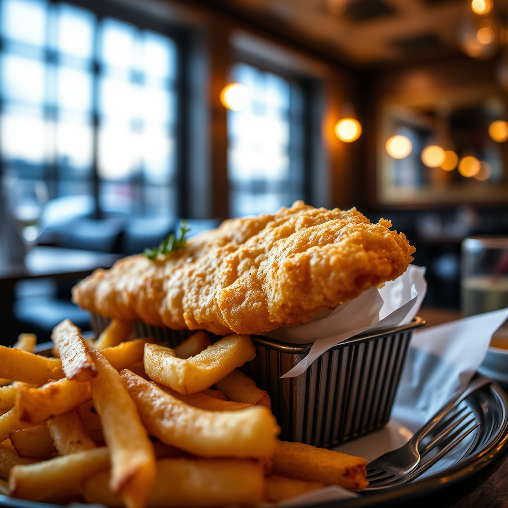 Style: macro shot | Genre: gourmet | Emotion: irresistible | Scene: fish and chips | Tags: premium cuisine photography, pristine composition, captivating lighting, opulent, refined, appetizing, indulgent, sophisticated | Camera: Nikon Z7 | Focal length: 85mm | Shot type: macro | Composition: balanced | Lighting: gentle directional glow | Production: culinary artist | Time: dusk | Location type: indoor restaurant.