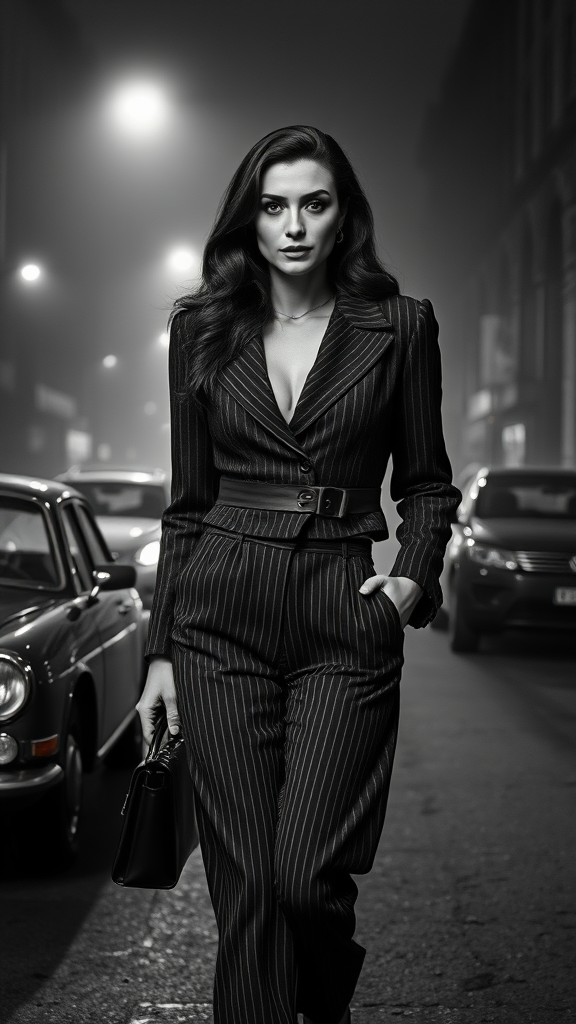 style_empire black and white film stock high contrast full body movie clip of a stunning detective woman from the 1940s walking down a misty, foggy street. She has long, shiny hair and dark reflective eyes with a hint of mystery. Her complexion is smooth with subtle freckles, enhanced by meticulous makeup. Wearing classic pinstripe trousers, she exudes elegance and confidence. The scene is lit dramatically with intricate lighting and street lights casting rim lighting on her figure. The depth of field focuses on the detective while capturing the detailed texture of her tweed clothing. Modern cars line the street, blending eras, while the air is filled with dust particles. The atmosphere is reminiscent of a noir film, capturing the essence of a bygone era with a contemporary twist, immersing viewers in a world of intrigue and allure.