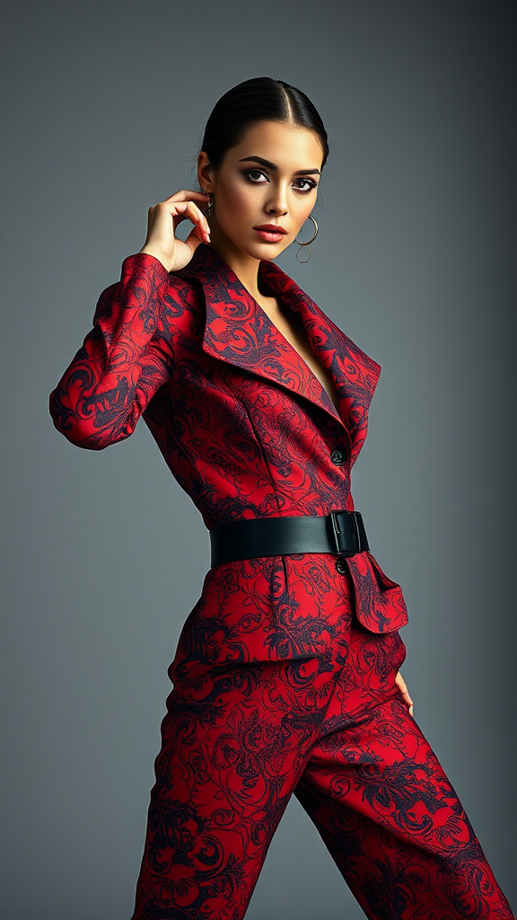 Stylish medium shot portrait of a stunning model striking a captivating pose in an elegant Balenciaga ensemble, fashion editorial vibe, intricately detailed, artistic excellence, vibrant contrast highlighting the fabric's rich textures.