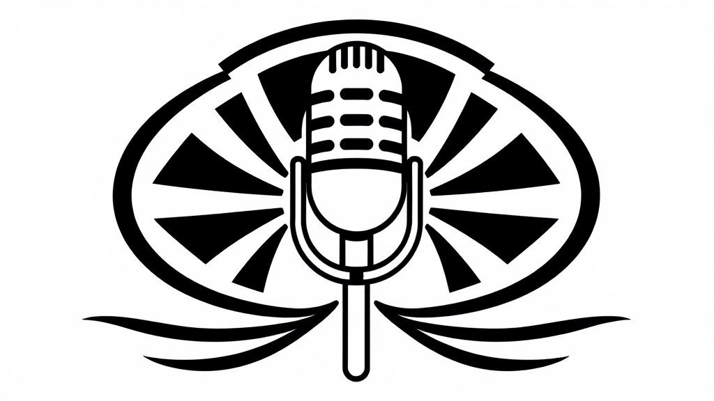 Stylized microphone emblem in monochrome ink design featuring sleek, curved lines and geometric shapes, rendered in a two-dimensional vector format for a modern aesthetic.