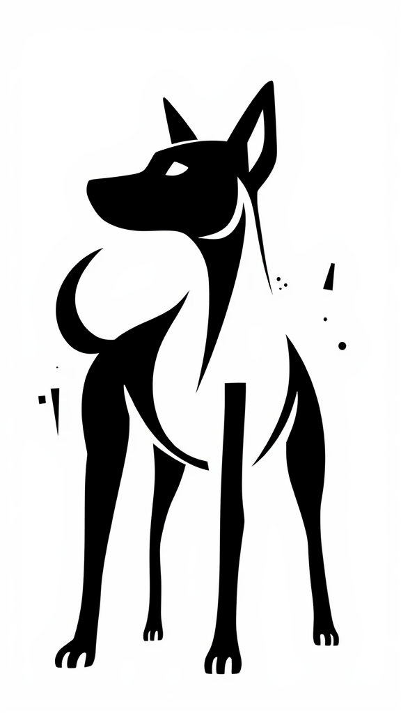 Stylized silhouette of a dog in black, featuring bold lines and geometric shapes on a crisp white background, with subtle abstract elements to add a unique flair while maintaining the essence of an iconic logo design.