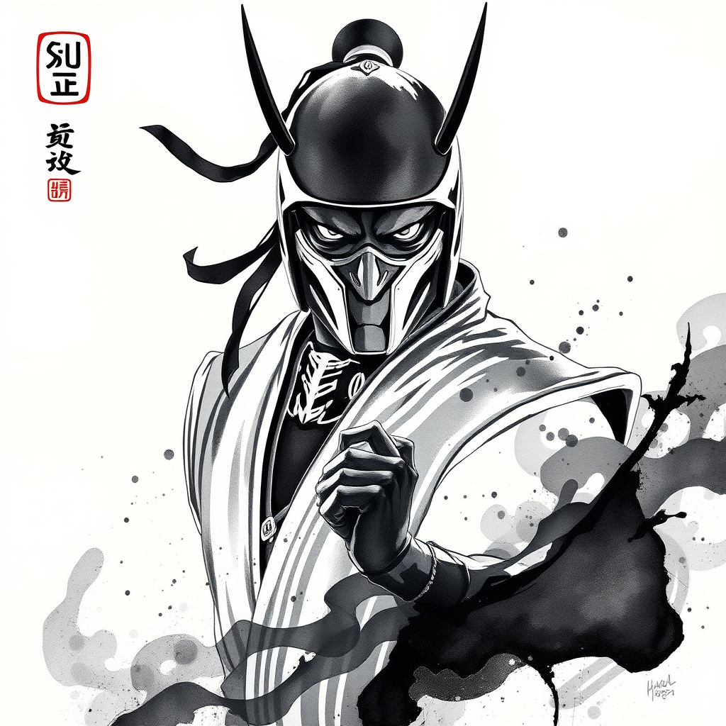 Sub Zero from Mortal Kombat, depicted in an ink artistic style with elegant typography elements, set against a minimalistic backdrop using complementary colors and abstract forms. The composition draws inspiration from traditional Chinese painting techniques on a pristine white background. Crafted in high detail to ensure a breathtaking 8k resolution image while incorporating subtle creative enhancements to bring a fresh perspective to the iconic character.