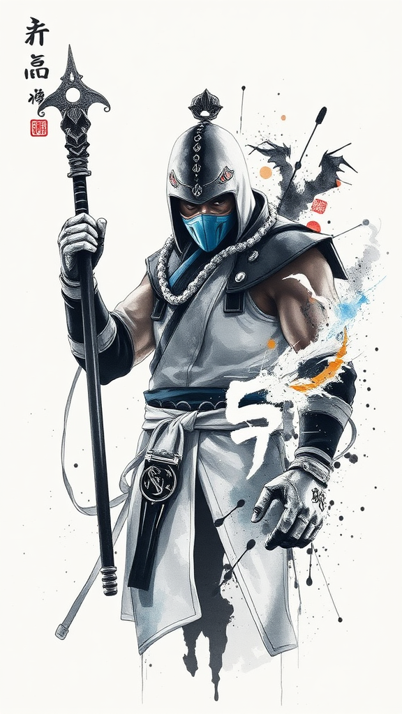Sub Zero from Mortal Kombat depicted in an ink artistic conception, featuring dynamic typography elements and abstract forms. Enhanced with complementary colors for striking contrast on a minimalist white background. The composition incorporates the simplicity and fluidity of Chinese painting, maintaining a clean and elegant aesthetic. Rendered in ultra-high definition, capturing intricate details and textures in 8k quality.