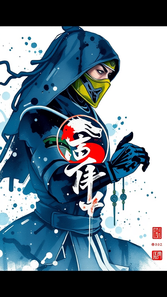Sub Zero from Mortal Kombat, depicted with an ink art style, featuring abstract typography elements intertwined with the character's design, utilizing complementary colors for visual impact, inspired by the simplicity of traditional Chinese painting, set against a pristine white background, rendered in stunning 8k resolution.