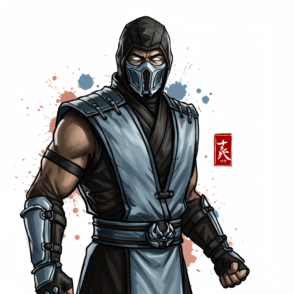 Sub Zero from Mortal Kombat in an ink artistic conception, featuring bold typography elements and abstract design. Utilize complementary colors to enhance the simplicity of the composition. Inspired by the elegance of Chinese painting, the artwork is set against a pristine white background. Design is rendered in stunning 8k resolution, with slight creative adjustments to maintain the essence of the original inspiration.