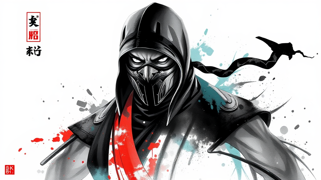 Sub Zero from Mortal Kombat in an ink artistic style with sleek typography elements, featuring abstract forms in complementary colors, blending simplicity and elegance reminiscent of traditional Chinese painting, set against a clean white background, in ultra-high definition 8K resolution, with subtle creative twists that enhance the core essence.